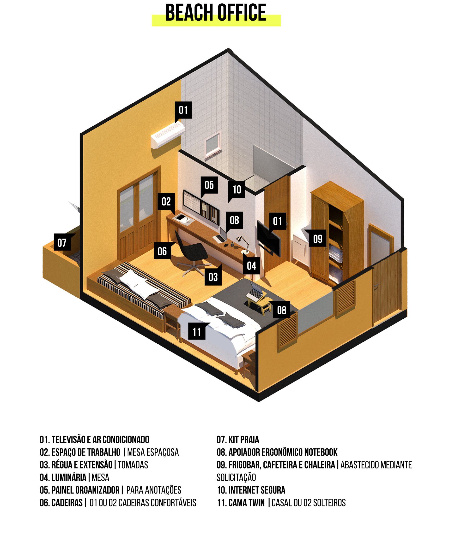 Criado a partir de nossa tradicional suíte luxo superior, o beach office conta com toda estrutura padrão além de diversos itens de escritório possibilitando uma melhor performance em seus dias de trabalho, como: