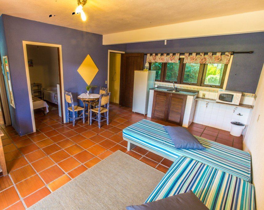It has 50 square m² of useful area and is ideal for 4 people, and can accommodate up to 6 people from the same family. Living room with 32' flat screen TV, open-plan kitchen equipped with microwave oven, refrigerator and sink, service area and two bedrooms with ceiling fan. The double bedroom is very spacious and bright with a beautiful hammock and views of the inn's internal gardens. The other bedroom has 2 single beds.