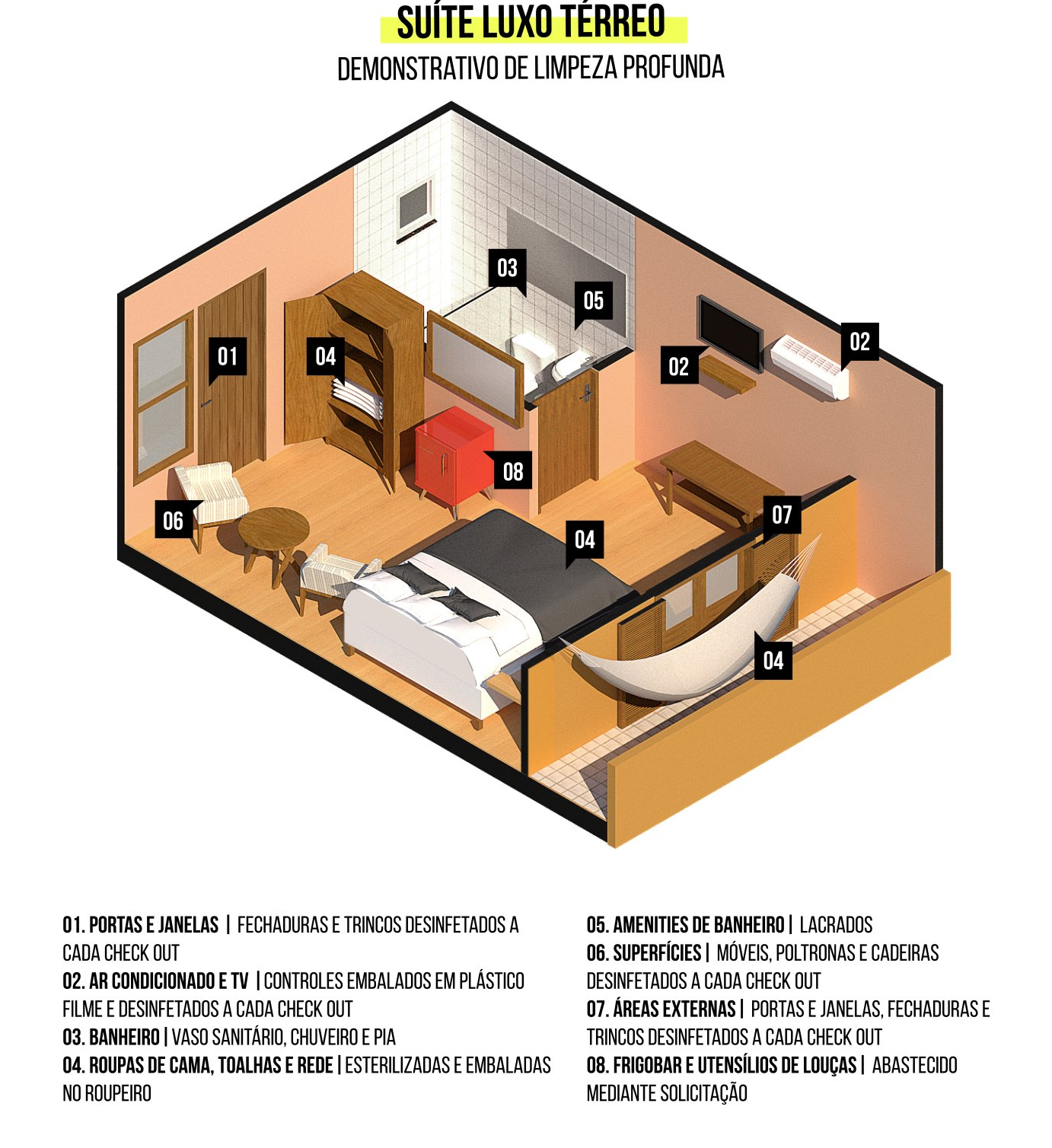 Cuentan con un espacio de 25m², cama box queen size, minibar, ventilación cruzada, aire acondicionado split, muebles de madera recuperada, secador de pelo, balcón privado con hamaca y TV por cable – pantalla plana de 32″.